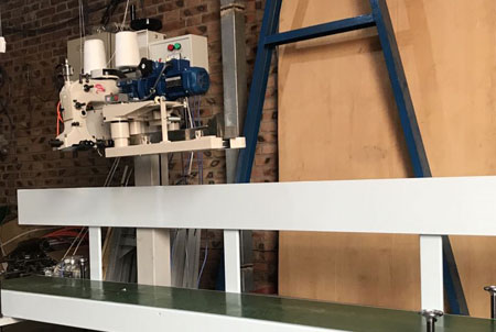 LFS bags convey-infeed-closing unit This unit, which is constituted by Automatic sewing head, bags infeed device, Belt conveyor and a column, is used to close bags filled with various products e.g. foodstuff, fertilizer, feed, & chemicals. It is suitable for stitching packing of paper bags woven bags after bag top folding.