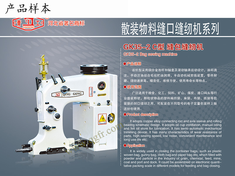 GK35-2C型縫包機(封包機),適合于糧食、化工、港口、建材等行業(yè)用于對塑料編織袋、麻袋、紙袋、布袋等 縫包封口使用。該縫包機采用人工控制啟停機,內藏式切刀剪切線辮,安全可靠,操作方便;關鍵部位采用優(yōu)質合金鋼和合金銅耐磨材料,使用壽命長,維護方便,深受廣大用戶的喜愛。 (同國際市場上80800C型縫包機)