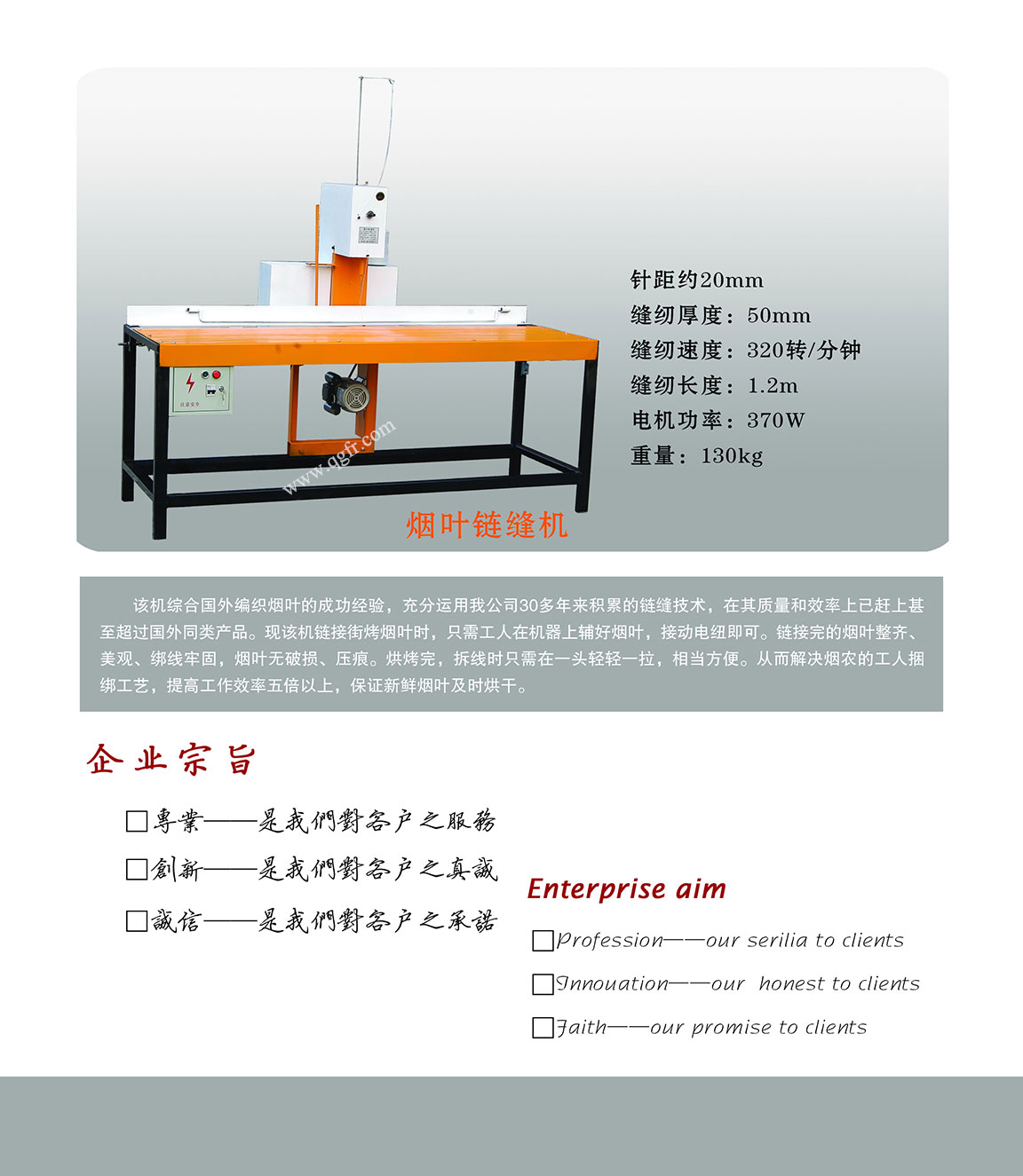該機(jī)綜合國外尤其是巴西編煙機(jī)的成功經(jīng)驗,充分運(yùn)用我公司20多年來積累的鏈縫技術(shù),在編煙質(zhì)量和效率上已經(jīng)趕上并超過國外同類產(chǎn)品,改變了以往國內(nèi)綁煙葉的人工作業(yè)方式,大大的減輕綁煙工人的勞動強(qiáng)度,提高勞動效率,保證新鮮煙葉及時烘干。與其他形式的編煙機(jī)相比,該編煙機(jī)的綁線牢固美觀,煙葉無壓痕、無破損;采用單線鏈?zhǔn)骄€跡,不僅節(jié)約用線成本,而且拆煙十分方便快捷。