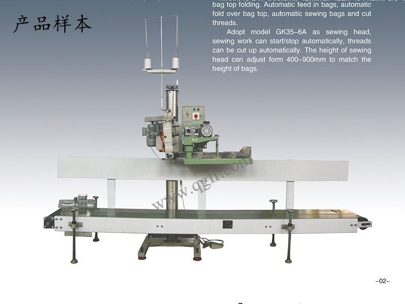 縫包機(jī)采用GK35-6系列或GK68-9全自動(dòng)縫包機(jī),光電控制自動(dòng)啟動(dòng)和停止縫合,自動(dòng)剪切線辨。縫包機(jī)在支撐立柱上的位置可以在400-900mm范圍內(nèi)自由調(diào)整,充分滿足不同高度包裝袋的縫合要求。